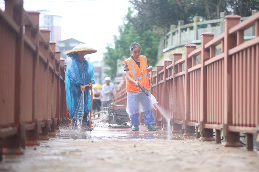 6月23日,通道侗族自治縣雙江河沿河步道,工人在清理淤泥。連日暴雨導致該縣雙江河沿河步道受淹,大量淤泥、雜物堆積。洪水退去后,當地立即組織人員開(kāi)展清淤和設施檢修作業(yè),全力保障居民正常生活秩序。李尚引 攝