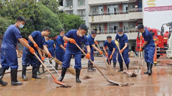 6月21日,國家消防救援局湖南機動(dòng)隊伍消防員在桑植縣澧源鎮第一小學(xué)進(jìn)行清淤作業(yè)。(國家消防救援局湖南機動(dòng)隊伍供圖)
