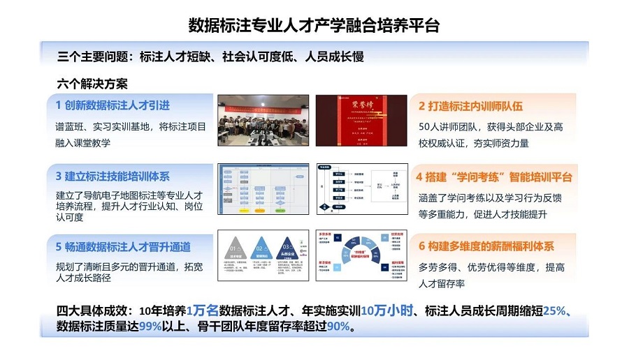 面對數據標注人才短缺、社會(huì )認可度低等問(wèn)題,案例提出校企產(chǎn)學(xué)融合模式,建設標注培訓師隊伍、技能培訓認證體系、智能培訓工具、人才晉升通道和成長(cháng)保障機制,構建了六位一體的系統化人才培養舉措方案。案例實(shí)施后,公司10年為社會(huì )和企業(yè)培養萬(wàn)余名標注人才;與國內50多所高校建立穩定校企合作,2024年實(shí)訓時(shí)長(cháng)超10萬(wàn)課時(shí),社會(huì )認可度顯著(zhù)提升;人才成長(cháng)周期縮短25%,數據標注質(zhì)量達99%,骨干團隊年度留存率超過(guò)90%。