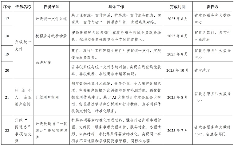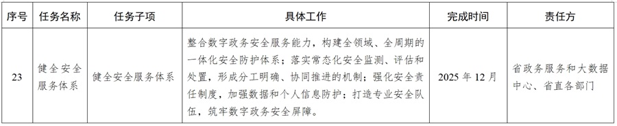 2025年12月31日前,統籌省級政務(wù)服務(wù)公共平臺基礎能力建設和保障,滿(mǎn)足全省數字政務(wù)公共基礎能力“總支撐”需求,通過(guò)完善統一身份認證、電子證照、電子印章、統一支付、統一用戶(hù)中心、應用能力開(kāi)放平臺、AI大模型等基礎支撐能力,全面支撐全省政務(wù)服務(wù)業(yè)務(wù)應用。整合數字政務(wù)應用安全服務(wù)能力,實(shí)現集中監控與管理,提升整體安全防護水平。