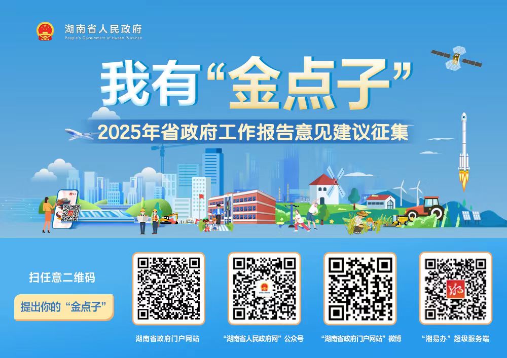 您對美好生活的向往,就是政府奮斗的目標。11月29日起,湖南省政府門(mén)戶(hù)網(wǎng)站聯(lián)合多家媒體與各市州、省直部門(mén)政府網(wǎng)站和政務(wù)新媒體以及“湘易辦”超級服務(wù)端,開(kāi)展“我有‘金點(diǎn)子’——2025年湖南省政府工作報告意見(jiàn)建議征集”活動(dòng),聽(tīng)取網(wǎng)民對政府工作的意見(jiàn)建議,科學(xué)謀劃2025年省政府工作。即日起至2025年湖南省兩會(huì )召開(kāi)前,網(wǎng)民可以通過(guò)活動(dòng)專(zhuān)欄對政府工作建言獻策,一起為湖南高質(zhì)量發(fā)展描繪新藍圖。