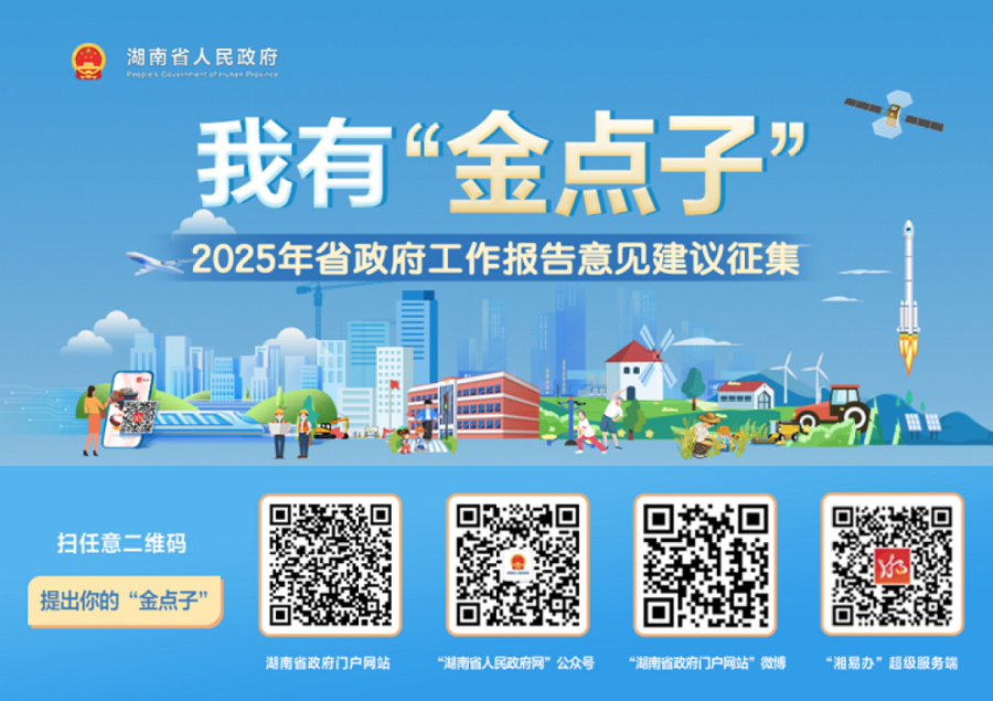 在2025年湖南省“兩會(huì )”即將召開(kāi)之際,為更好聽(tīng)民意知民愿聚眾智,做好2025年省政府工作報告起草工作,即日起至2025年湖南省兩會(huì )召開(kāi)前,湖南省政府門(mén)戶(hù)網(wǎng)站聯(lián)合多家媒體與各市州、省直部門(mén)政府網(wǎng)站和政務(wù)新媒體以及“湘易辦”超級服務(wù)端,開(kāi)展“我有‘金點(diǎn)子’——2025年湖南省政府工作報告意見(jiàn)建議征集”活動(dòng)。