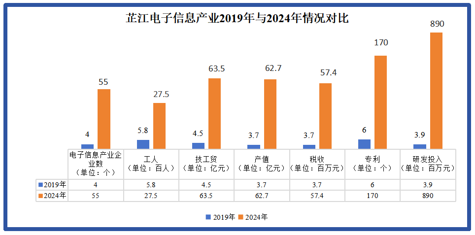 2024年,芷江全縣電子信息產(chǎn)業(yè)企業(yè)數55家,較2019年增長(cháng)1275%;工人2750人,較2019年增長(cháng)374%;技工貿63.5億,較2019年增長(cháng)1311%;產(chǎn)值62.7億,較2019年增長(cháng)1590%;稅收5740萬(wàn),較2019年增長(cháng)1450%;專(zhuān)利170個(gè),較2019年增長(cháng)2733%;研發(fā)投入8.9億,較2019年增長(cháng)22720%。