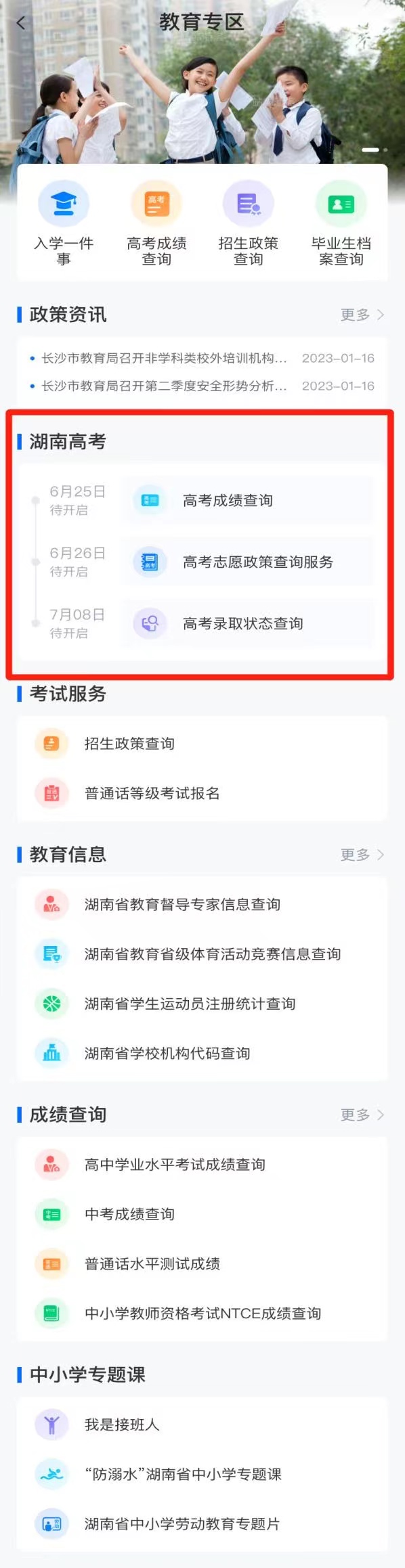 湖南省高考成績(jì)和錄取控制分數線(xiàn)于6月25日公布。今年,考生可通過(guò)“湘易辦”超級服務(wù)端“智慧教育”專(zhuān)區服務(wù)查詢(xún)2023年湖南高考成績(jì)、高考志愿政策及高考錄取狀態(tài)。