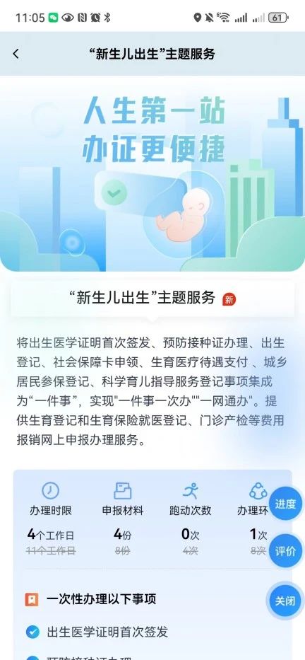 在“湘易辦”首頁(yè)“高效辦成一件事”專(zhuān)區進(jìn)入“新生兒出生”一件事。出生醫學(xué)證明、上戶(hù)口、醫保、社保等六個(gè)事項一次聯(lián)辦,辦理材料、辦理流程、辦理進(jìn)度實(shí)時(shí)顯示,一網(wǎng)通辦無(wú)遺漏,新手媽媽也無(wú)憂(yōu)。