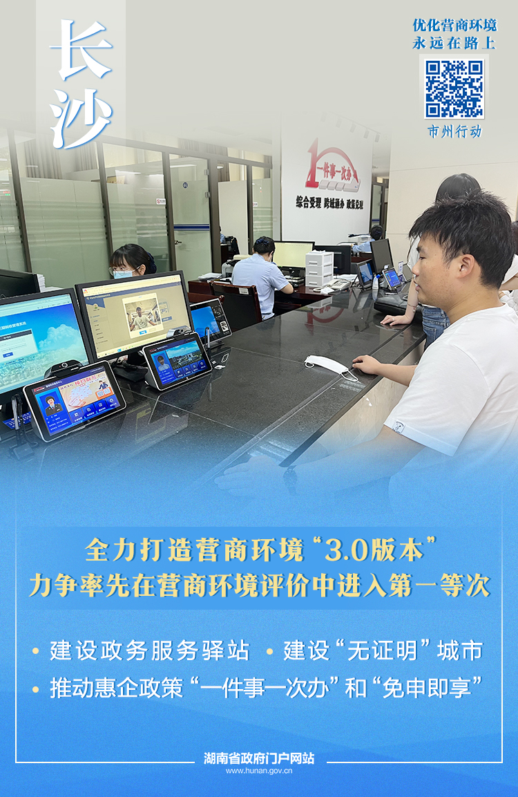 日前,長(cháng)沙全市各級各部門(mén)迅速落實(shí)“十個(gè)堅決”要求,以推進(jìn)三年行動(dòng)計劃為契機,全力打造營(yíng)商環(huán)境“3.0版本”,力爭在中國營(yíng)商環(huán)境評價(jià)中進(jìn)入第一等次。