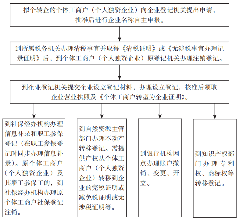 《個(gè)體工商戶(hù)擬升級設立企業(yè)證明書(shū)》和原前置審批許可文件證件及審批機關(guān)要求提交的有關(guān)申請材料到工商部門(mén)進(jìn)行登記,如前置許可發(fā)生了變化,轉型升級企業(yè)在成立后再到相關(guān)部門(mén)辦理前置許可文件、證件的變更手續,辦好后到工商部門(mén)備案或辦理變更。