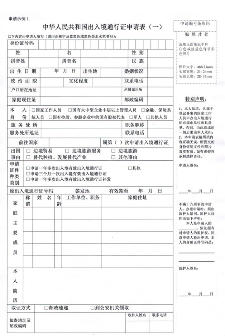 (一)近期免冠照片一張以及填寫(xiě)完整的《中華人民共和國出入境通行證申請表(一)》(以下簡(jiǎn)稱(chēng)申請表);