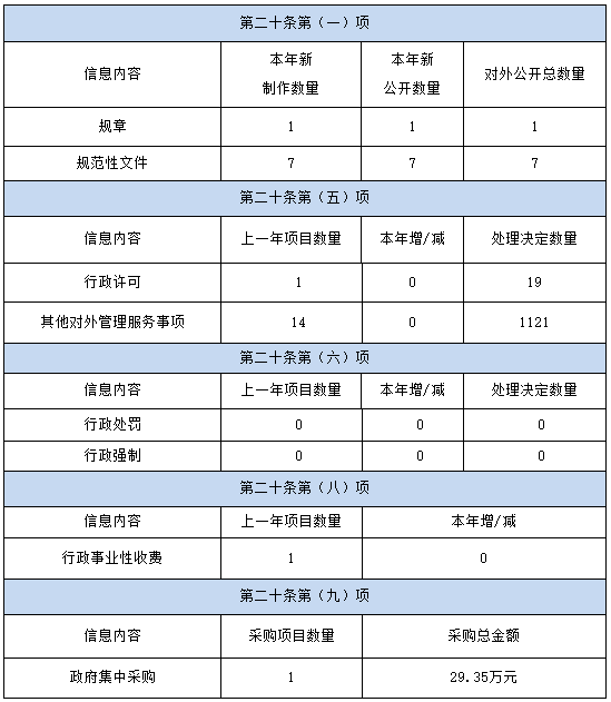 2019年,我廳主動(dòng)公開(kāi)規章1件,規范性文件7件;實(shí)施行政許可2項;其他對外管理服務(wù)事項14項;實(shí)施政府集中采購1項,采購總金額29.35萬(wàn)元。