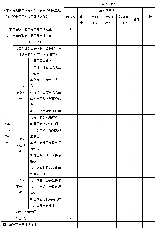 2019年,我廳收到政府信息公開(kāi)申請9件,全部為自然人申請并全部按期辦結,其中予以公開(kāi)的2件、重復申請的1件、其他處理的6件。