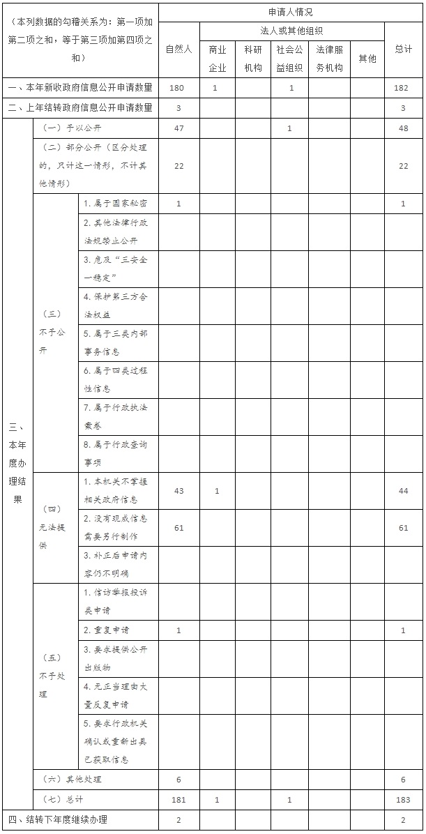 切實(shí)保障人民群眾依法獲取政府信息,按照“集中受理、分散辦理、全程跟蹤”的原則,對政府信息公開(kāi)申請事項進(jìn)行審核、受理、登記、分發(fā)、追蹤、答復、歸檔等規范化流程處理。2019年共收到政府信息公開(kāi)申請182件,除結轉到下一年辦理的2件外,均按期依規依程序答復,全年未收取信息處理費。發(fā)生行政復議8件、行政訴訟5件,已經(jīng)審結12件、尚未審結1件,沒(méi)有發(fā)生結果糾正或敗訴情形。