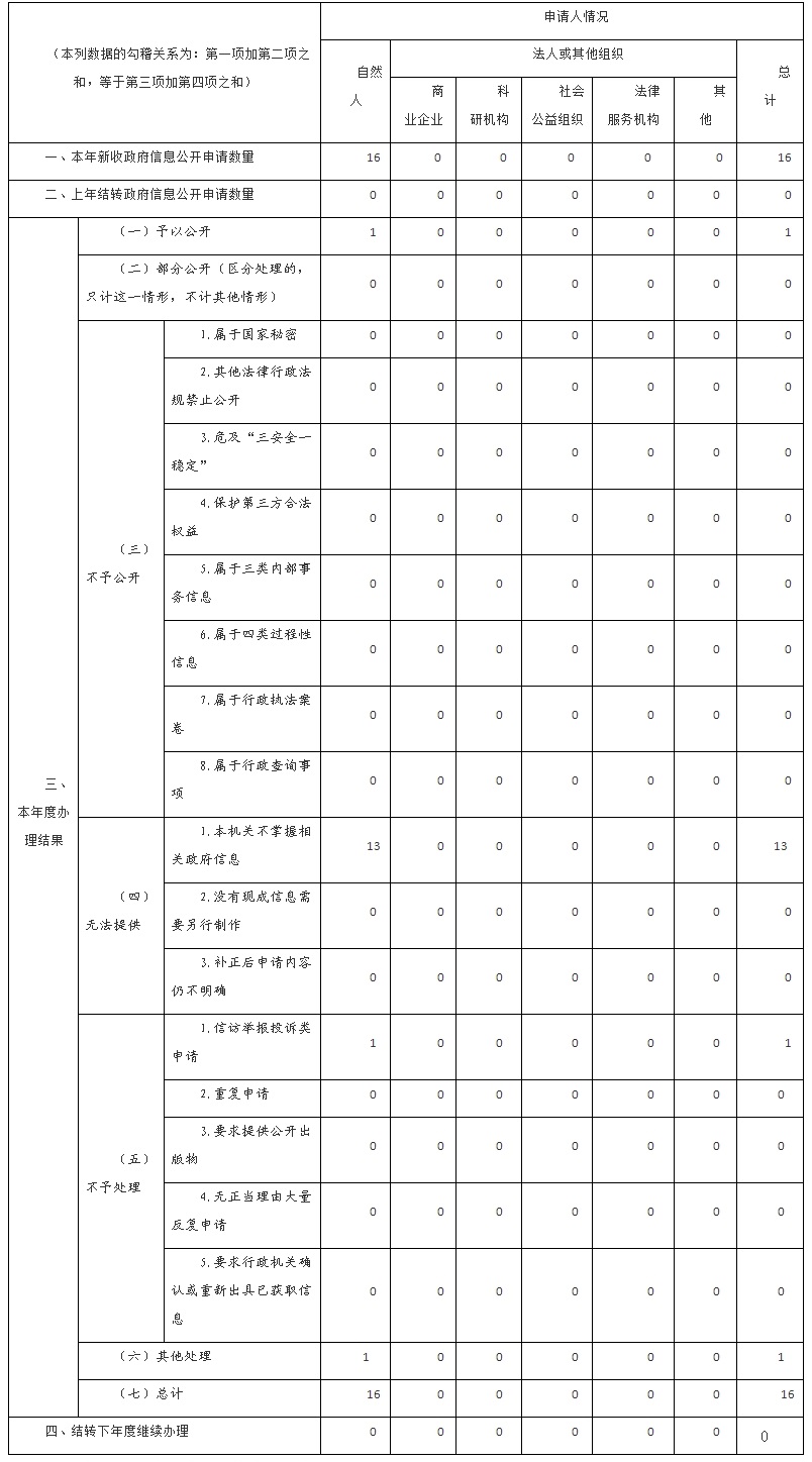 ?。ǘ╆P(guān)于依申請公開(kāi)情況。規范依申請公開(kāi)工作,根據新修訂的《中華人民共和國政府信息公開(kāi)條例》,重新梳理依申請公開(kāi)事項類(lèi)型及處理方式,制定依申請辦理流程圖,優(yōu)化受理渠道,明確各環(huán)節辦理責任,建立依申請公開(kāi)事項臺賬,修訂答復書(shū)模板,規范救濟途徑表述,依法依規做好答復工作。全年共收到政府信息公開(kāi)申請16件,均按規定進(jìn)行了答復。