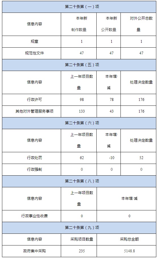 本年度報告根據《中華人民共和國政府信息公開(kāi)條例》(國務(wù)院令第711號)(以下簡(jiǎn)稱(chēng)“條例”)編制,由總體情況、主動(dòng)公開(kāi)政府信息情況、收到和處理政府信息公開(kāi)申請情況、政府信息公開(kāi)行政復議和行政訴訟情況、存在的主要問(wèn)題及改進(jìn)情況、其他需要報告的事項六個(gè)部分組成。